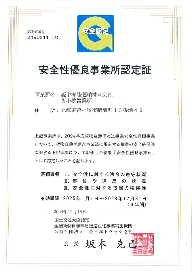 菱中海陸運輸では実運送業を営む全ての営業所(苫小牧営業所、東北営業所、新潟営業所、東京営業所、九州営業所、八代営業所)においてGマーク取得しております。今後もお客さまの大切な貨物を安心確実に、高品質な輸送サービスでお届けすることをお約束するため、Gマーク取得維持に向けて安全対策に取り組んでまいります。